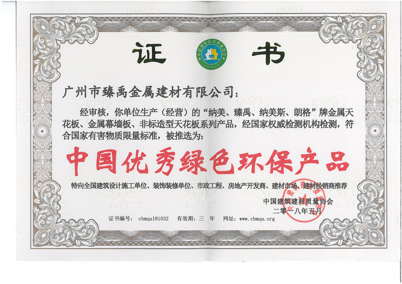 中國優(yōu)秀綠色環(huán)保產(chǎn)品證書